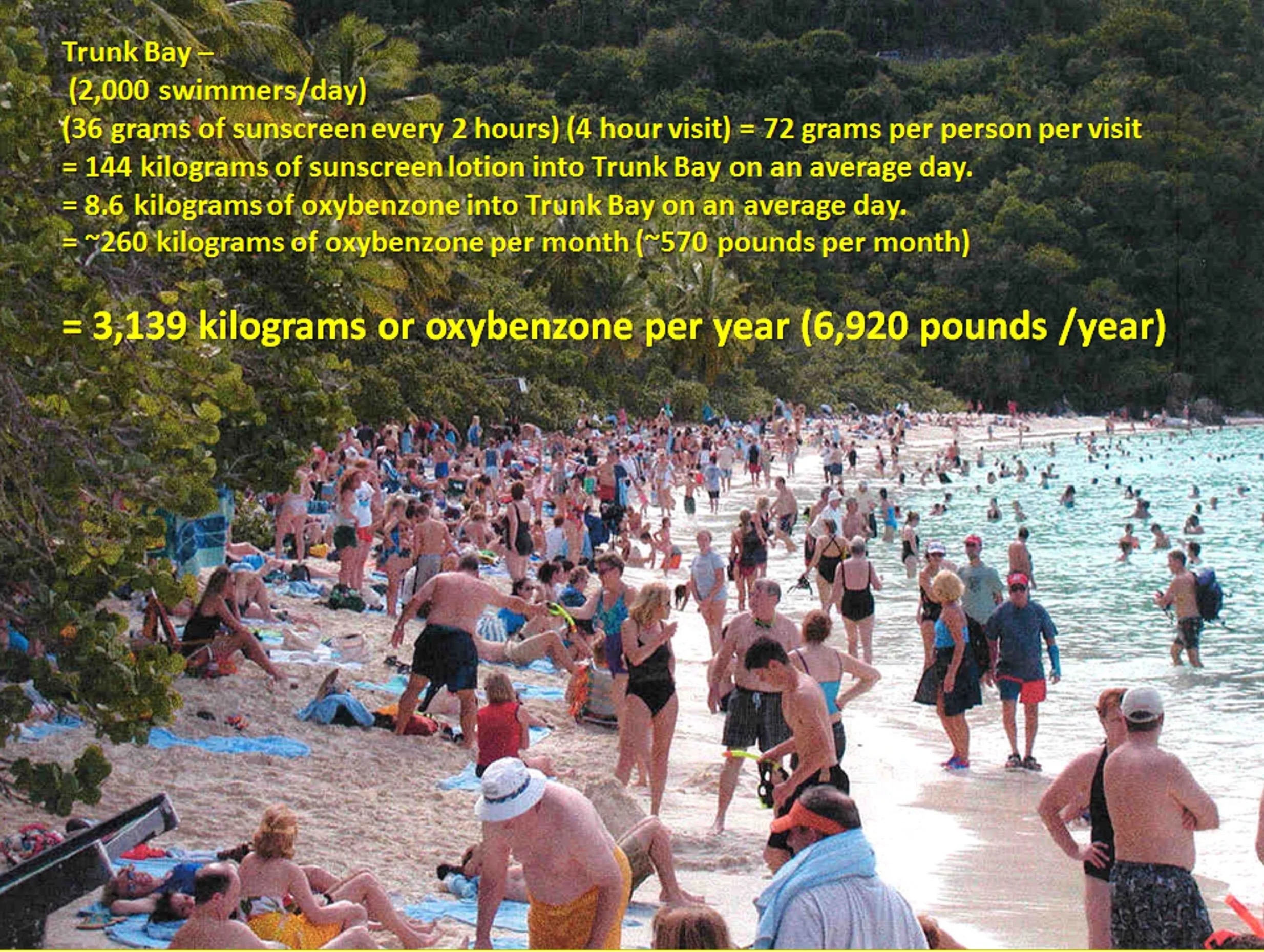 Oxybenzone How much sunscreen product and Oxybenzone are at Trunk Bay, U.S. Virgin Islands? How much sunscreen product and Oxybenzone are in Maui, Hawaii and Ahihi Kina’u Nature Reserve?